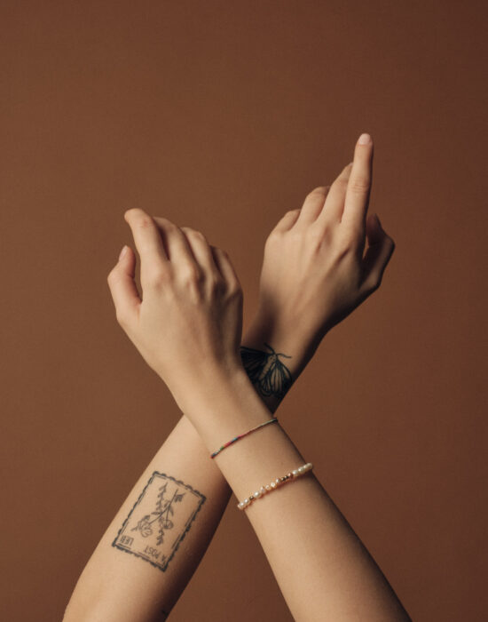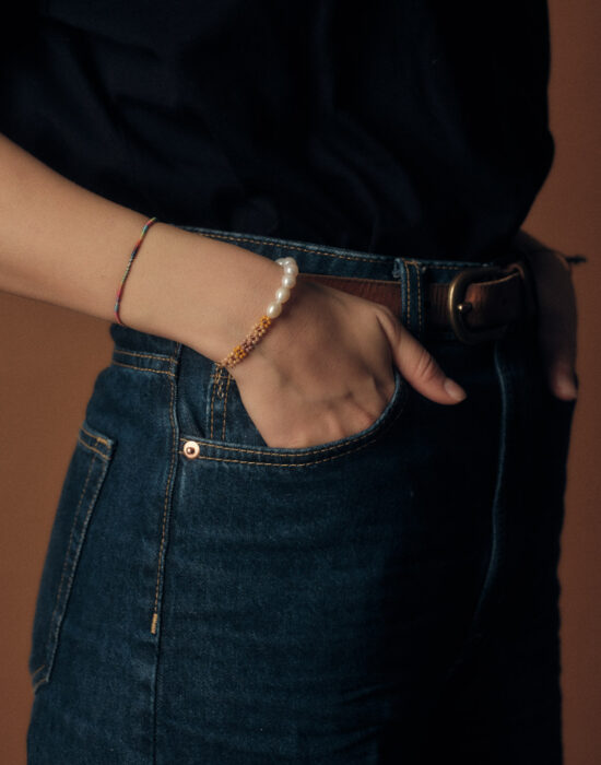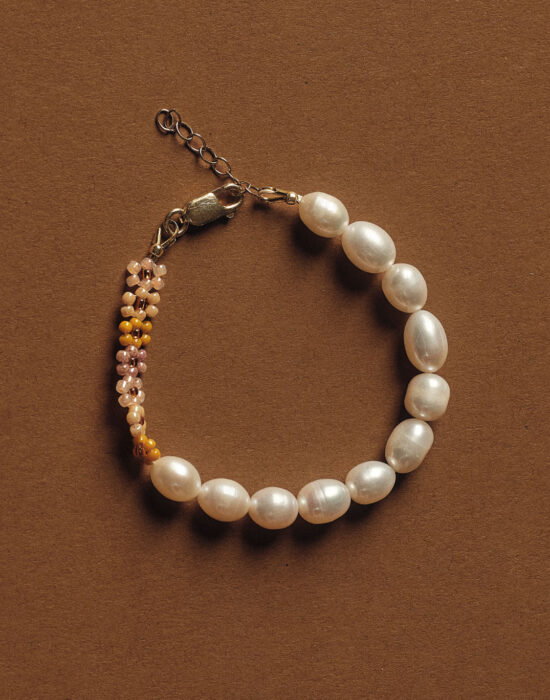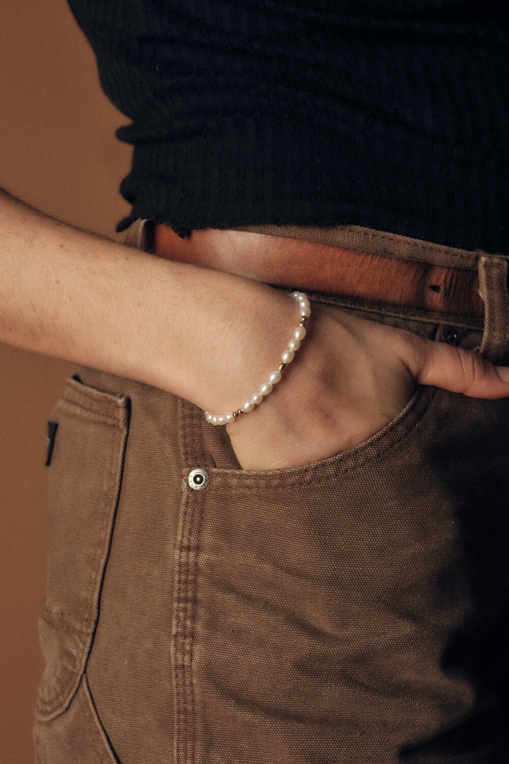 Armkette mit weissen Süsswasserperlen und vergoldeten Perlen aus 925er Silber.