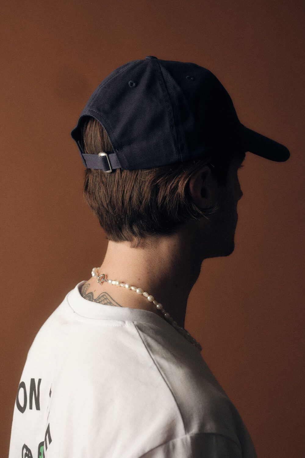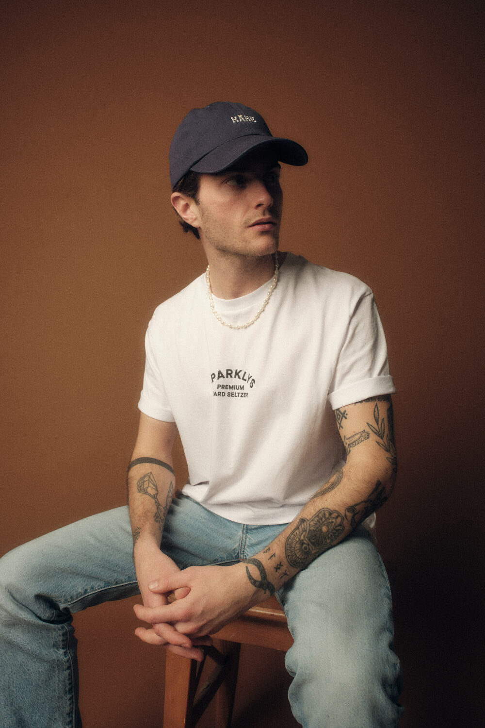 Dunkelblaues Cap mit gesticktem Logo in Weiss und Gelb.