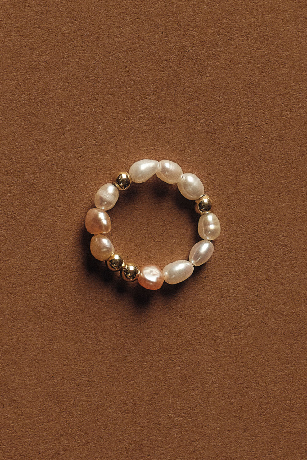 Ring mit weissen und rosafarbenen Süsswasserperlen und vergoldeten Perlen aus 125er Silber.