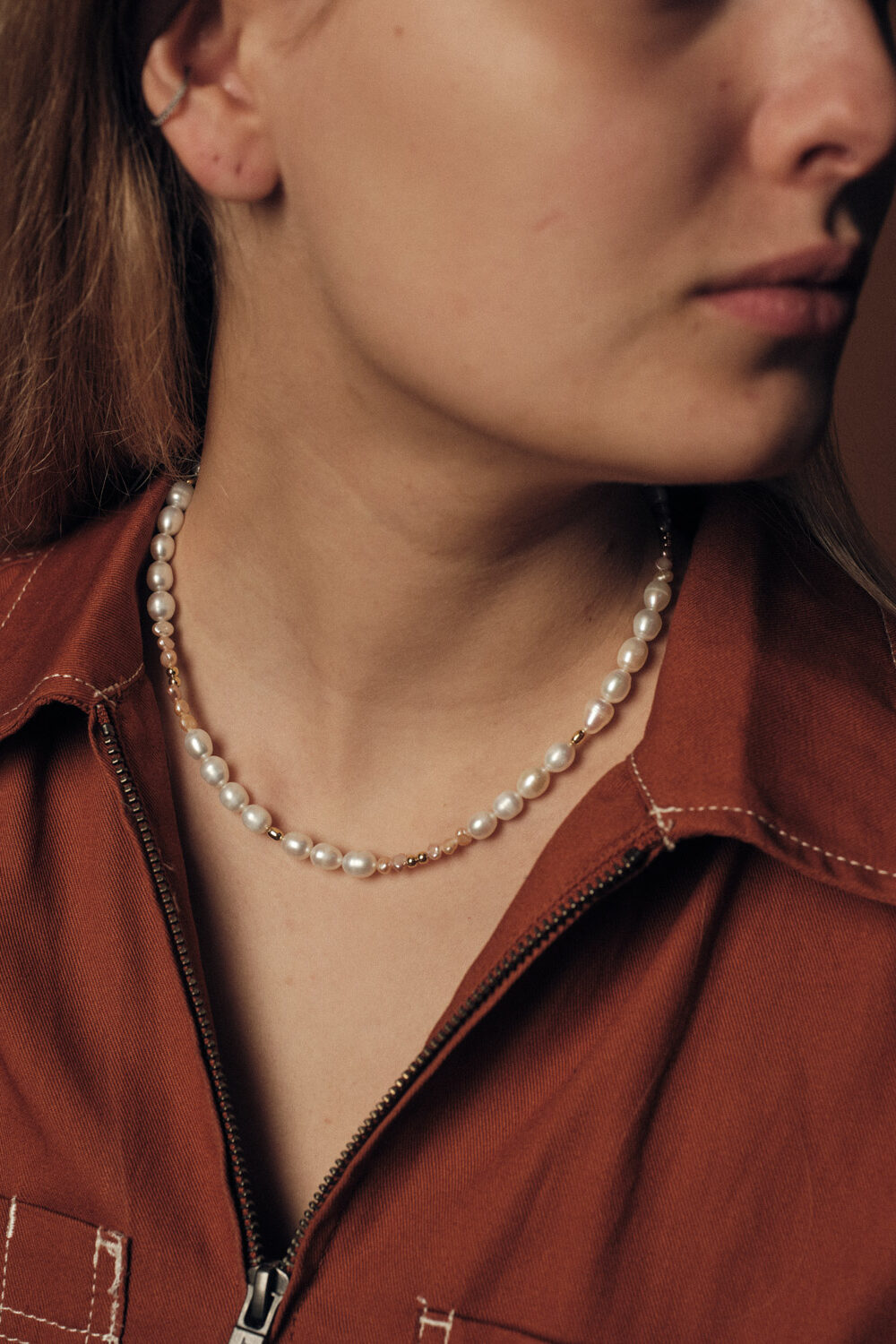 Halskette mit weissen und rosafarbenen Süsswasserperlen und vergoldeten Perlen aus 925er Silber.