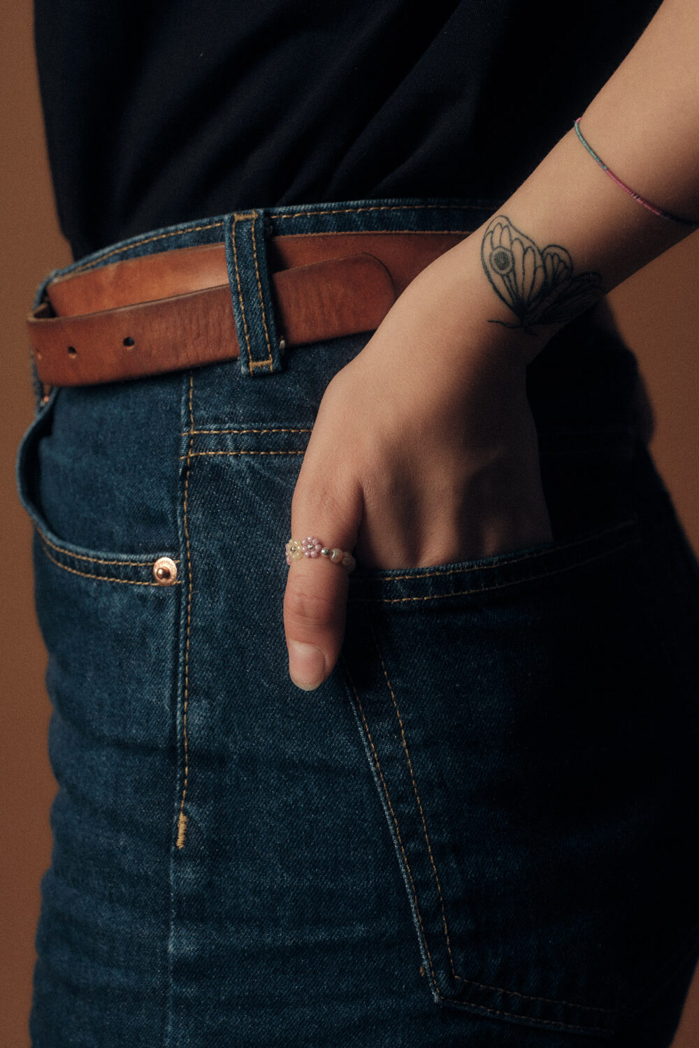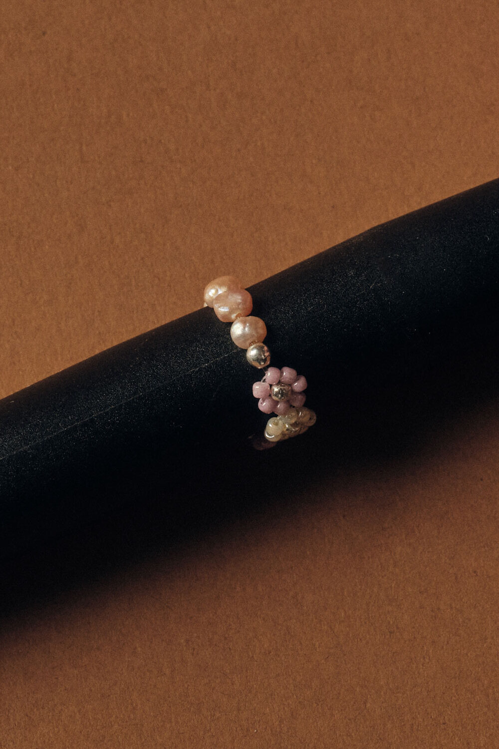 Elastischer Ring mit lilafarbenen und weissen Perlblumen und rosafarbenen Süsswasserperlen.