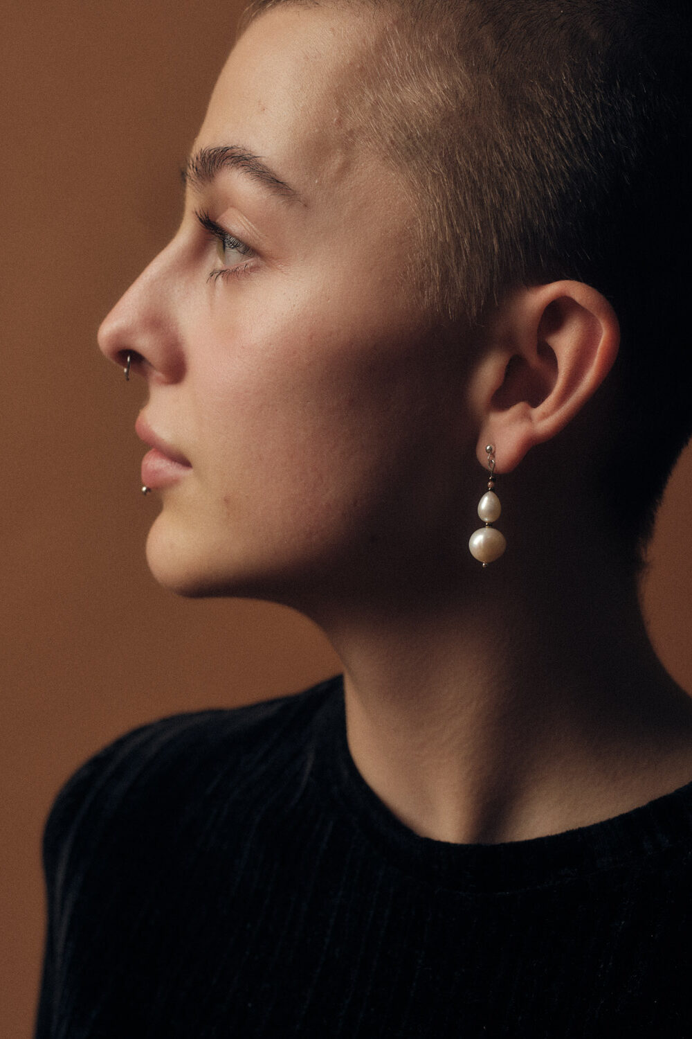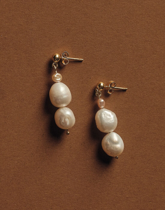 Ohrringe mit weissen Süsswasserperlen, dazwischen Glasperlen in lila und bronze und einem Stecker aus 925er Silber.